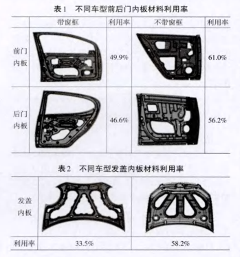 制作設計中,制作造型結構的不同,材料利用率不同,不同的造型結構對材料利用率的影響也比較大。一般車身前后門內(nèi)板有窗框的材料利用率低,無窗框的材料利用高率,如表1所示,造型奇特的材料利用率低,常規(guī)設計的材料利用率高,如表2所示。