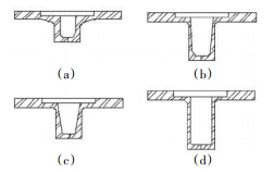 根據(jù)模擬及實(shí)驗(yàn)結(jié)果,確定了成形定位柱的四步工藝方案,如圖4所示。第一工步凹模鑲件型腔采用流線型型腔,有利于材料流動(dòng)。通過圖4中 a~d 4次