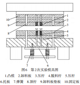 模具結(jié)構(gòu)對(duì)解決定位柱被拉斷、表面拉傷及頂部破裂等難題有較大的幫助。模具結(jié)構(gòu)應(yīng)該保證凸模同定位柱的凹模脫料桿一起下行及回程,在模具運(yùn)行的一個(gè)成形及卸料的行程中,模具凸模不能脫離定位柱頂部的內(nèi)表面,脫料桿不能脫離定位柱頂部的外表面。否則會(huì)出現(xiàn)定位柱被拉斷、 表面拉傷及頂部破裂等缺陷。第2次模具實(shí)驗(yàn)采用如圖6的模具結(jié)構(gòu), 其它3次模具結(jié)構(gòu)類似, 其工作過程為: 頂桿8同凸模等高,模具下行時(shí), 固定在固定板 10的頂桿 8與凸出在凹模板上的壓桿 3連同托板 6一起壓下, 從而保證凸模 1同脫料桿4同步下行, 凸模回程時(shí)在彈簧7的作用下保證凸模同脫料桿4同步上行, 直到定位柱被頂出為止。