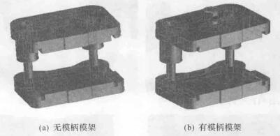 模具一般情況下都有上模板和下模板(或稱上模座和下模座),導(dǎo)柱和導(dǎo)套。上模板和下模板與導(dǎo)柱和導(dǎo)套合裝在一起,稱之為模架;蛘呱夏0搴拖履0迮c導(dǎo)柱和導(dǎo)套合裝在一起且?guī)в心1哪<。所以模架只有兩種形式:沒有模柄的模架(圖1-6(a))和帶有模柄的模架(圖1-6(b))。沖床也基本上只有機(jī)械式壓力機(jī)和液壓機(jī)兩種類型,而且這兩種不同類型的沖床工作方式是一樣的,即滑塊上下一個來回就完成一個沖壓過程(行程)。板料沖壓從兩個方面來分,就是成形工序(材料轉(zhuǎn)移或變形)和分離工序(板料的分離)。成形工序中又根據(jù)變形形狀或模具不同,再取不同工序名稱,如彎曲、拉深、脹形及翻邊等;同樣,分離工序分可分沖孔、落料、切斷及剖切等。無論在成形工序或分離工序中如何稱呼不同的工序名稱,對沖壓生產(chǎn)時使用的沖床來說,板料分離基本上采用速度較快的機(jī)械式壓力機(jī),板料成形及材料轉(zhuǎn)移或變形一般采用速度較慢的液壓機(jī)。沖壓模具設(shè)計(jì)者的任務(wù)就是:無論何種沖壓工序,模具結(jié)構(gòu)設(shè)計(jì)的結(jié)果和要求都是要保證在沖床一個上下來回(行程)中完成生產(chǎn)出合格的沖壓零件。